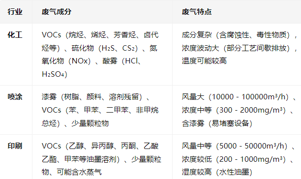 化工、噴涂、印刷行業(yè)的廢氣成分、風(fēng)量、濃度差異顯著,需針對性處理: