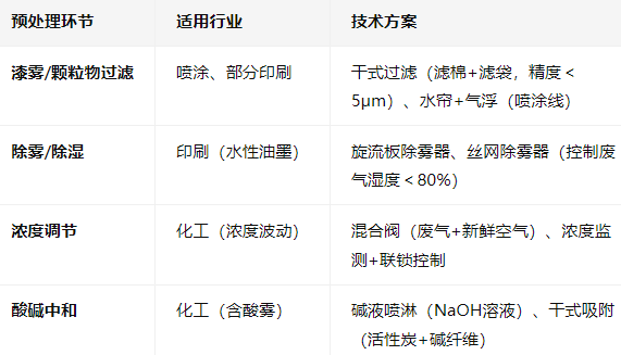 預(yù)處理目的是去除干擾物質(zhì)、調(diào)節(jié)廢氣參數(shù),避免TO內(nèi)堵塞、腐蝕或燃燒異常: