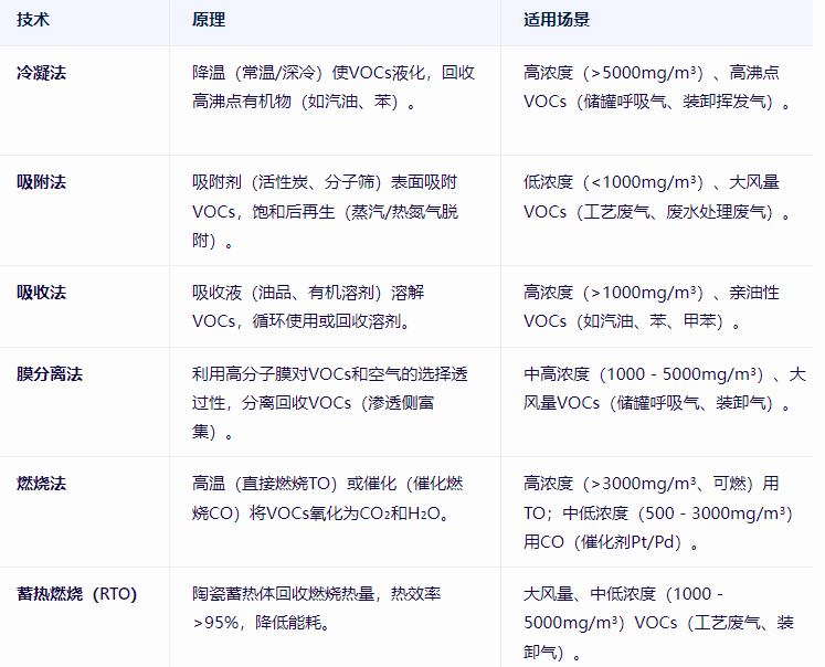 高濃度儲(chǔ)罐呼吸氣:先冷凝回收汽油/苯(回收率70-80%),殘余氣再吸附(活性炭)或膜分離,最后燃燒(TO/RTO)。