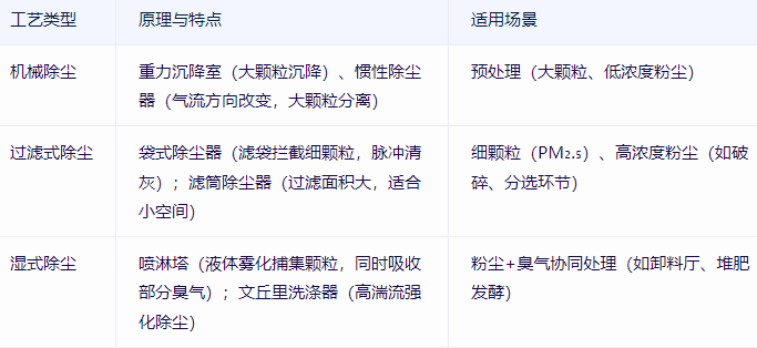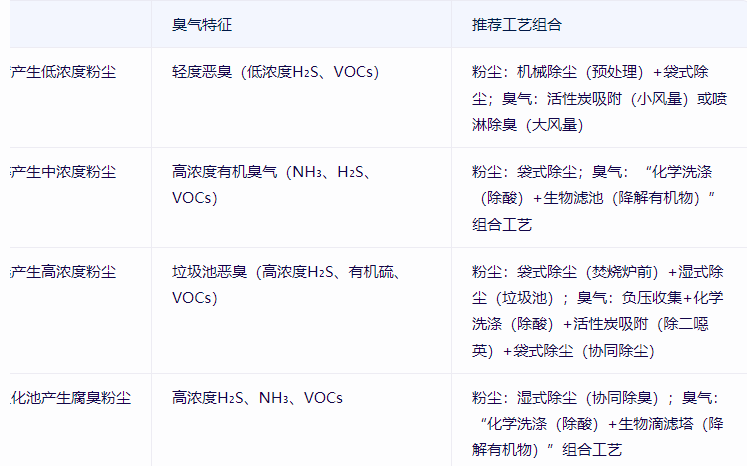 垃圾處理場景(轉(zhuǎn)運站、堆肥廠、焚燒廠)的粉塵與臭氣特征差異大,工藝需針對性匹配: