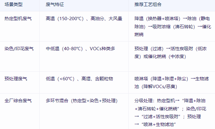 印染企業(yè)需根據(jù)廢氣來源、濃度、風(fēng)量匹配工藝,典型場景如下: